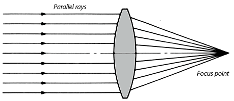 When the light parallel to the optical axis enters the convex lens, the ideal lens should concentrate all the light at one point and then spread it out in a cone shape. This point where all the light is gathered is called the focal point.