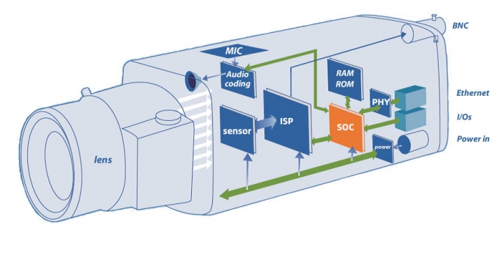 On the whole, we can divide the interior of the security camera into three major parts: image acquisition, video image processing and coding, and image output.