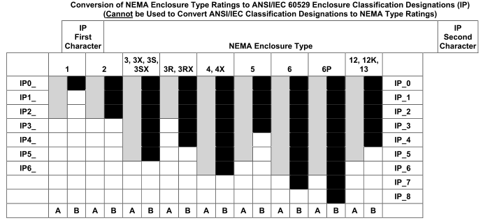The following two tables compare the link between the NEMA 250-2018 standard and the IEC 60529 IP code. It should be noted that the values between these two standards are not completely equal: NEMA standard values and other product characteristics and tests that are not covered by the IEC 60529 standard (such as functions under icing conditions, enclosures in hazardous areas, cable connections Beating etc.).