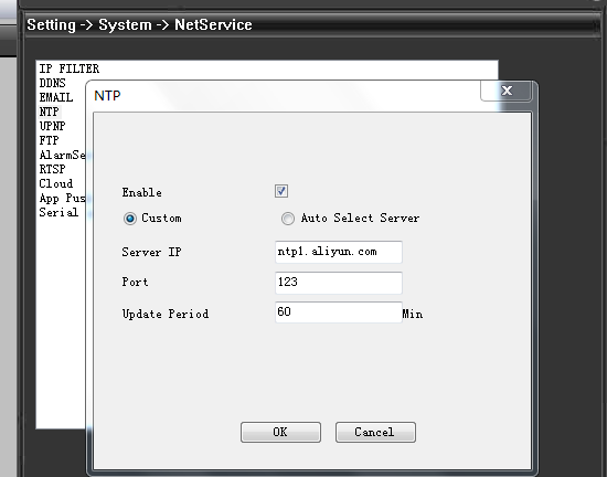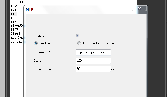 The picture below is a setting interface of a certain brand of network camera using NTP to synchronize time. We can enter the available NTP server and set the time synchronization period. The camera will automatically calibrate with the time provided by the NTP server within the set period.